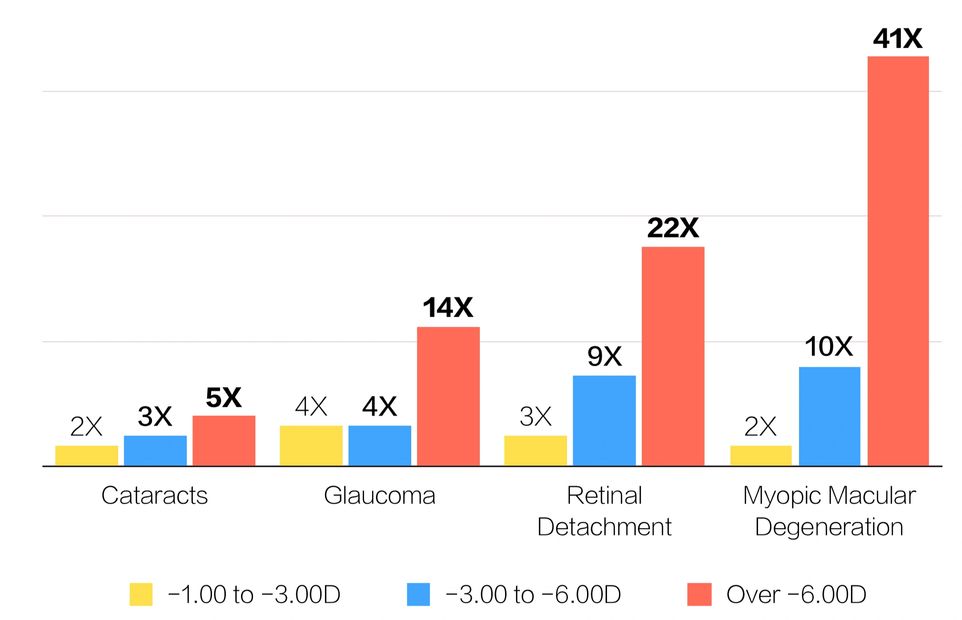 Patients with up to -3.00D of myopia has 3x the risk, up to -6.00D has 5x the risk and over -9.00D has 7-9x the risk of these myopia diseases.